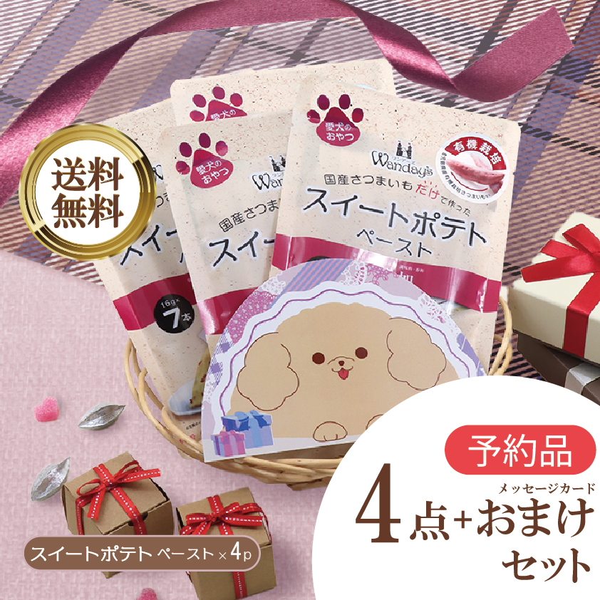 | 今年の愛犬やご友人へのバレンタインプレゼントにスイートポテトペーストはいかがですか。 今年も【送料無料】のお買い得な「バレンタインandホワイトデーセット」をご用意いたしました! 本日1月13日より予約販売中! 【セット内容】 通常版 スイートポテトペースト7本入り × 4P おまけ:メッセージカード おまけのメッセージカードは、バレンタインギフトに添えるだけでより気持ちが伝わるかわいいデザインです。 期間限定販売となっておりますので、この機会をぜひお見逃しなく! ※発送は1月21日以降順次発送いたします。 |
